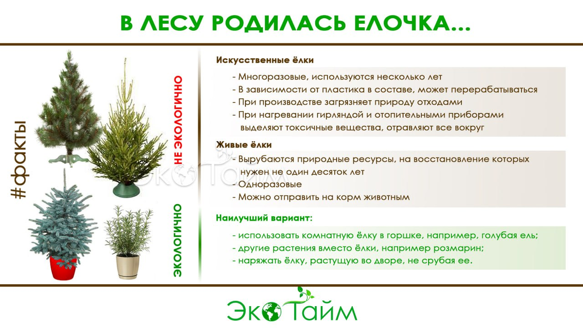 🎄 Спор о том, что лучше и экологичнее - искусственные елки или елки настоящие, часто вызывает множество разногласий и дебатов среди людей. ❗️ Карта фактов поможет сделать конечный выбор в зависимости от предпочтений и ценностей каждого. Важно помнить о возможных экологических последствиях этого выбора и принимать меры для минимизации их воздействия. Экологически осознавать последствия! Очень хорошей альтернативой являются живые елки, которые можно выращивать в горшках в домашних условиях и потом посадить в землю после праздников. В лесу или у себя на участке. Отличный способ и праздник с ёлочкой отметить и лесной фонд пополнить. 🌲 А древние славяне на Новый год наряжали не ель, а березу. Да и праздновали весной в день весеннего равноденствия. Наряжать домашние елки под Новый год в России начали только в XIX веке, благодаря Петру Первому. Как вам вариант березы вместо елки? 💞 Помощь проекту 💞 ☘️ Возьми ЭкоТайм Подробная инструкция по сортировке отходов находится в телег