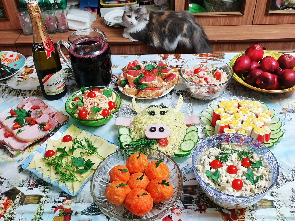Соль, перец — по вкусу 3. Жареная утка с портвейном и клюквой 4. Картофельный гратин с трюфельным маслом 5. Медовик "Магия Нового Года" 6. Новогодний коктейль "Северное сияние" Выберите блюда в соответствии с предпочтениями ваших гостей и наслаждайтесь волшебным вечером в кругу близких. Приятного аппетита и счастливого Нового Года!