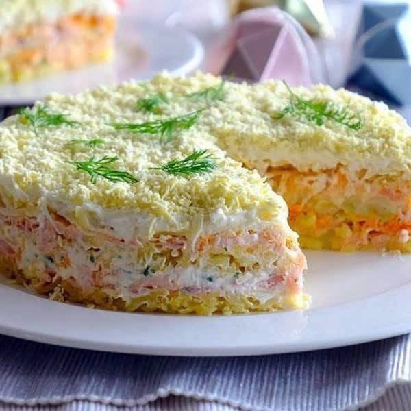 ✅ ПРАЗДНИЧНЫЙ САЛАТ "МИМОЗА" С ГОРБУШЕЙ ИНГРЕДИЕНТЫ: РЕЦЕПТ ПРИГОТОВЛЕНИЯ: Отварите морковь и картофель в подсоленной воде. Натрите картофель и морковь на мелкой тёрке. Сварите яйца вкрутую. Разделите на белки и желтки. Белки натрите на тёрке. Желтки раскрошите. Филе горбуши отварите на пару, посолите и остудите. Разберите вилкой на мелкие кусочки. Очистите яблоки и натрите на мелкой тёрке, сбрызните лимоном. Мелко нарежьте зелёный лук и укроп. На блюдо поставьте кольцо разъемной формы. Первым слоем положите половину картофеля, немного посолите и смажьте майонезом. Вторым слоем положите половину рыбы, смажьте майонезом. Распределите лук и укроп. Следующий слой – половина моркови, смажьте майонезом. Повторите слои картофеля, рыбы и моркови, смазывая каждый слой. Затем выложите слой яблок, смажьте майонезом. Выложите белки, хорошо смажьте майонезом. Украсьте салат желтками. Накройте салат пищевой плёнкой и уберите в холодильник на 2-3 ч. Перед подачей оставьте на 15 мин при