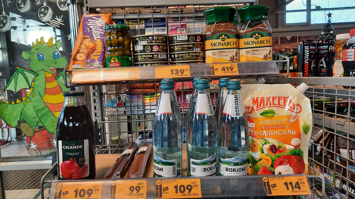 Всем привет,приглашаю посмотреть товары со скидкой в Пятерочке.Для вас снимаю обзоры из магазинов,ваша подписка будет самым лучшим подарком. Магазин находится Ростовская область,Зерноградский район,станица Мечетинская,ул.Ленина,62 И начнем с товаров у кассы. Шоколад Милка,300 г,молочный с карамельной начинкой и обжаренным фундуком,цена со скидкой 269.99 руб. Корнишоны Дядя Ваня,460 г,по французски,цена со скидкой 149.99 руб. Шпроты Вкусные консервы,в масле с ключом,цена со скидкой 139.99 руб. Кофе Монарх 180 г,натуральеый,растворимый,сублимированный,цена со скидкой 419.99 руб. Майонез Махеев Провансаль,630 г цена со скидкой 114.99 руб. Вода Боржоми минеральная 0.5 л в стеклянной бутылке цена со скидкой 109.99 руб. Колбаса Дубки Особая,200 г по акции 1+1 цена за 1 шт. 99.99 руб. Сок гранатовый 0.75 л,цена со скидкой 109.99 руб. Напиток Добрый Кола,1.5 л,б/алк.,цееа со скидкой 109.99 руб. Горошек зеленый Кормилица,400 г цена со скидкой 69.99 руб. Кукуруза сахарная 425 мл ,ж/б цена со ск