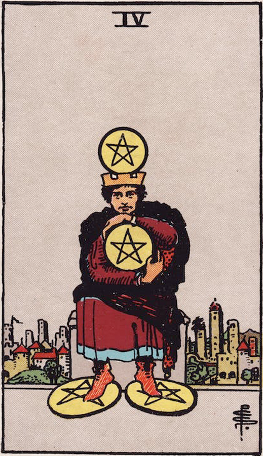Еще одна простая для прочтения карта. Давайте сначала посмотрим на ее внешний образ. На переднем плане, на простом, но добротном то ли троне, то ли стуле сидит уверенный в себе мужчина. Он скорее уже пожилой, чем зрелый. Его ноги стоят на двух монетах, третью он крепко держит в руках. И только четвертая монета непонятным образом держится у него на голове, или в короне. Кому как больше нравиться. Что это значит? Значит это жадность. Человек не хочет выпускать из-под контроля большую часть своих активов: две под ногами и одна в руках. Уйти из-под контроля может только одна монета, которая у него на голове. Но и тут большой вопрос. Вдруг она там намертво прикручена? Что тогда? Даже если не так, он сидит, ему легко держать равновесие и попробуй – дотянись. На ногах у него ботинки, но шнурки на них развязаны. Он дома. А дом у него за спиной – это целый город. Вот и получаем мы рачительного хозяина, который устойчиво стоит на ногах, держит под контролем всё, что происходит в его доме и не