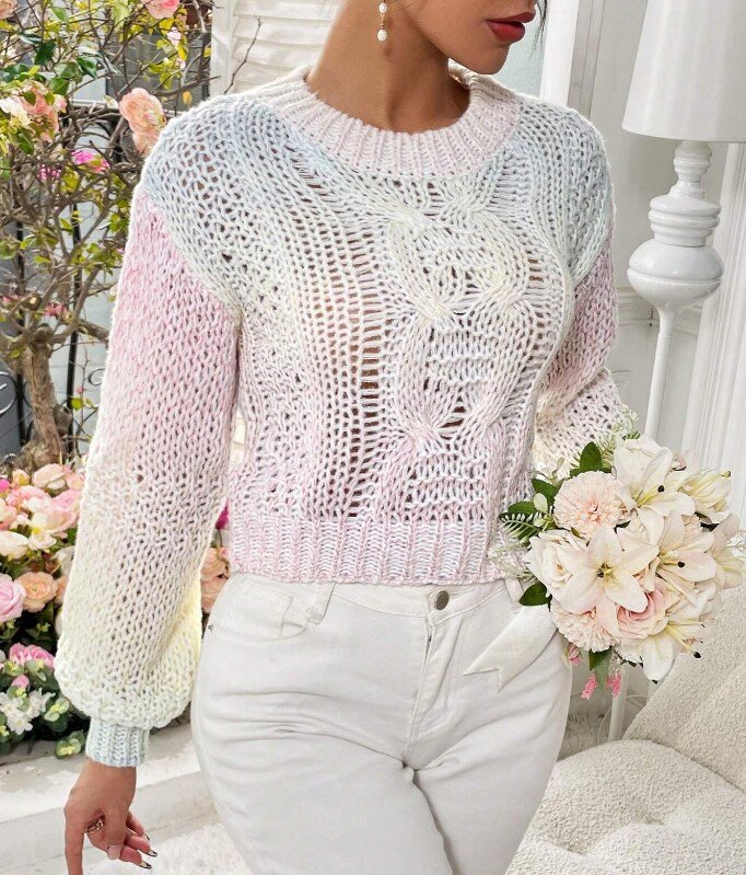 Очень красивый цвет пряжи с переходом: от голубого, к желтому, а затем к розовому. Спинка вяжется лицевой гладью.