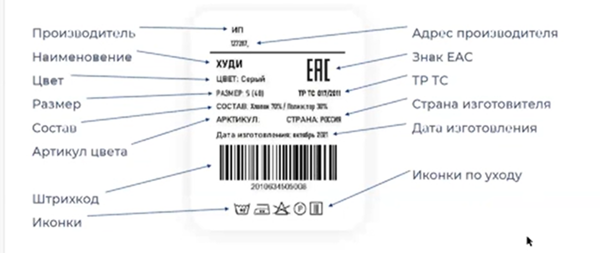 Как создать этикетку и ШК. Этикетка должна соответствовать законам РФ. В технических регламентах прописаны требования (например:ТР ТС 017/2011) Маркировка продукции должна быть достоверной,читаемой и доступной для осмотра и идентификации. Маркировку наносят на изделие ,этикетку,прикрепленную к изделию,или товарный ярлык,упаковку изделия ,упаковку группы изделий или листок-вкладыш продукции. Маркировка должна содержать следующую обязательную информацию: -наименование продукции -наименование страны- производителя -наименования производителя или продавца или уполномоченного изготовителем лица -юридический адрес изготовителя,продавца или уполномоченного изготовителем лица -размер изделия -состав сырья -товарный знак(при наличии) -единый знак обращения продукции на рынке государств членов Таможенного союза. -гарантийные обязательства изготовителя (при необходимости) -дату изготовления -номер партии продукции(при необходимости). На любой бирке и штрих-коде должны быть минимум: -Штрихкод