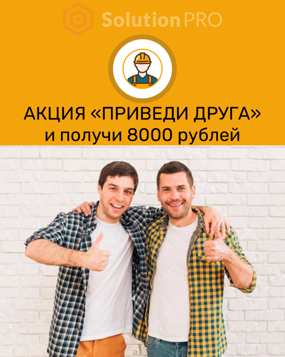 Компания Solution PRO рада сообщить вам о постоянно действующей АКЦИИ "ПРИВЕДИ ДРУГА" 👯♂️ Приводите на работу друзей, родственников, знакомых и получите БОНУС - 8000₽ за каждого💸 Вам нужно просто рассказать своим знакомым о нас и попросить своего товарища указать, что он пришел на собеседование по вашей рекомендации. Приводите как можно больше людей и получайте вознаграждение🎁 Чтобы узнать подробнее, переходите на наш сайт и оставляйте заявку, а наши менеджеры свяжутся с вами в ближайшее время ⬇️