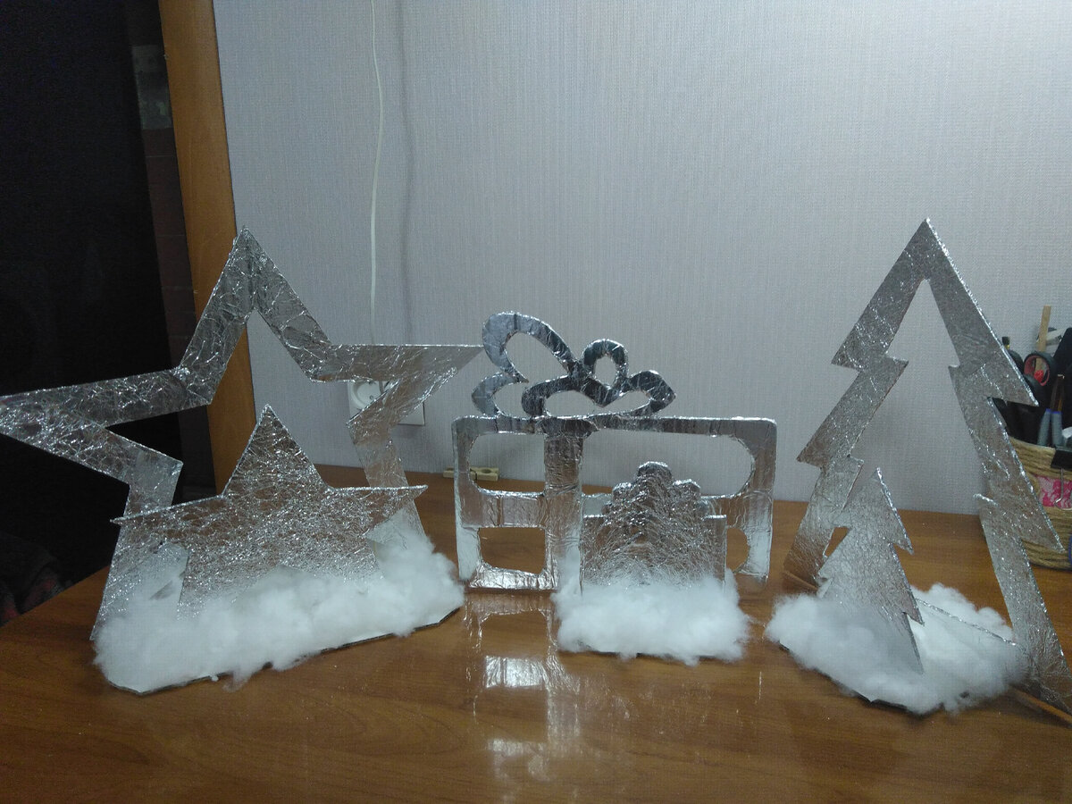 Бывает ходишь, занимаешься своими обычными, бытовыми, рутинными делами, и тут как нападет на тебя вдохновение! И как справиться с этим желанием создать что-то из ничего? Остается только брать и делать эту самую конфетку. Вот недавно и на меня напало желание сделать декоративные элементы (опять же для садика) для украшения стола с детскими поделками. Получилось просто, быстро и из того что обычно есть дома у каждого, по-этому не могу не поделиться. Что нам нужно: Вырезаем из картона желаемые фигуры в двух размерах (большая - контурная и маленькая - цельная). Я вырезала елку, подарок и звезду. Далее по обеим сторонам каждого элемента приклеиваем двусторонний скотч. Потихоньку отклеивая защитный слой приклеиваем предварительно помятую фольгу. Я клеила небольшими кусочками обворачивая их вокруг. Элементы декора готовы, вырезаем из картона подходящие под фигуры площадочки (прямоугольники с закругленными углами). С помощью клеевого пистолета приклеиваем фигуры на подставки строго перпенди