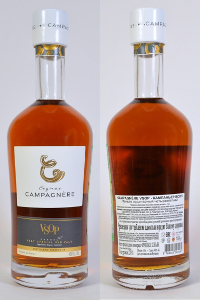 Коньяк Campagnere разливает плодовитая Tessendier. Cсылку на сайт я взял на cognac-expert. Сайт по этой ссылке не желает иметь дело с российским пользователем (country not allowed), а на импортных языках выдает для немцев и англичан разные напитки, но коньяка среди них нет. Коробки нет, видимо для удешевления.