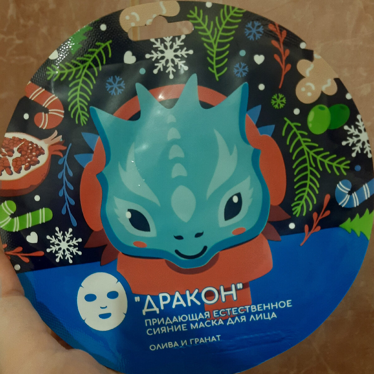 Доброго дня, сегодня хочется поделиться впечатлениями о красивой и приятной маске для лица с оливой и гранатом. ✨️ Общая информация ✨️ 🎄 Информация от производителя 🎄 Придающая естественное сияние маска для лица с веселым рисунком "Дракон". Будь собой, выпусти внутреннего зверя! И не важно, кто это - хомяк, киса или дракон. А олива и гранат пока займутся делом - напитают твою кожу, подарят ей тонус и естественное здоровое сияние. И правда, внутри маска с милыми дракончиками. Как я поняла из описания, то имеются и другие варианты масок (с другими зверями), но в магазине был представлен лишь один вариант на стенде с новогодними товарами. ❄️ Упаковка ❄️ Красивая, с символом наступающего года (дракон). Будет прекрасным дополнением к новогоднему подарку. На оборотной стороне есть информация о составе, способе применения, мере предосторожности и условии хранения. В верхней части упаковки имеется насечка, чтобы упаковку можно было открыть легко без помощи ножниц. ⭐️ Состав ⭐️ 💫 Аромат 💫 П