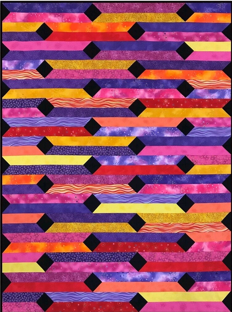 Бриллиантовое путешествие /Diamond Trip Готовый размер 50 x 64” Дизайнер Донна Джордан (Donna Jordan), компания Jordan Fabrics Расход ткани: учитываем, что расход дан на ширину ткани 110 см для американского хлопка! 40 готовых полос шириной 2 ½”, раскроенных на всю ширину ткани (110 см для американского хлопка) 1 ярд контрастной ткани (на квадратики) ½ ярда для окантовки изделия 3 1/8 ярда для обратной стороны изделия Выберите 8 полос и разрежьте на 4 каждую размером 10” x 2 ½”. Итого 32 полосы. Возьмите оставшиеся 32 длинных полосы и разрежьте каждую на 2 полосы размером 20” x 2 ½”. Итого 64 полосы. Контрастная ткань: нарежьте полосы 10 х 2 ½” на ширину ткани. Разрежьте каждую полоску на 16 квадратов 2 ½”. Итого 160 квадратов. Нарисуйте диагональ на обратной стороне каждого квадрата. Расположите квадрат на оба края 20” полосы как показано ниже и проложите строчку по диагонали. Обрежьте излишки на расстоянии ¼” от диагонали и разутюжьте. Расположите квадраты на