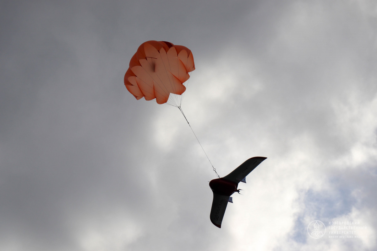 Раскрытие парашюта — не сюрприз для смотрящих. Об этом предупреждает приложение, сообщая скорость, время и радиус приземления: «Десять метров… пик… пять метров… пик…». Во время раскрытия парашюта БПЛА переворачивается камерой вверх, чтобы она не повредилась. Операторам немного не повезло: ветер отнёс парашют чуть дальше, чем думала система. Мгновение свободного падения, и беспилотник уже издает «пип… пип» откуда-то из кустов. Звук облегчает поиски. Но всё равно кажется, что «птичка» плачет и просит поторопиться.