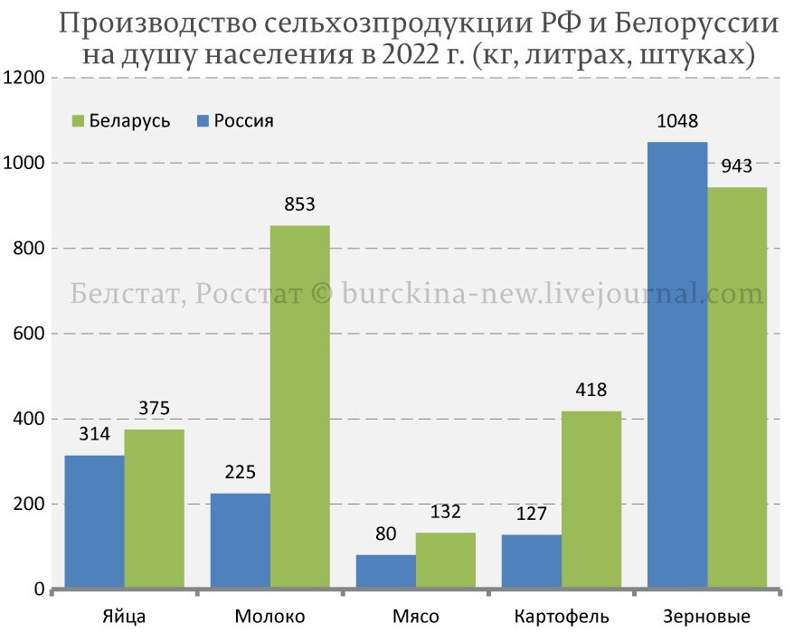 Видно, что маленькая Белоруссия кроет, как бык овцу большую Россию по производству молока, мяса, яиц и само собой -- картофеля. То есть Белоруссии действительно есть чем поделиться с Россией.