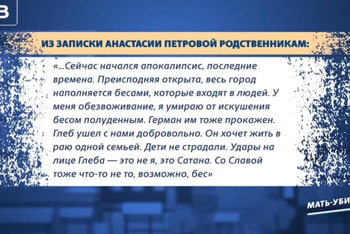 Мотивом расправы стала уверенность Анастасии, что дети погрязли во грехе и в них вселились бесы. В августе стало известно, что женщину признали невменяемой.