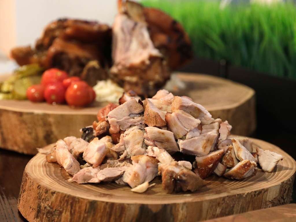 «Берём морковку, лучок, чесночок, сельдерей, соль, перец… В общем, всё, что есть в каждом магазине и в каждом холодильнике. В течение двух часов рулька с овощами будет томиться на мангале в казане. Предварительно мы её промыли, обожгли над плитой (или над другим открытым огнём) и убрали волоски. Теперь надо нашпиговать», – объясняет шеф-повар и делает в рульке надрезы, в которые отправляет чеснок – он поможет раскрыть вкус мяса.