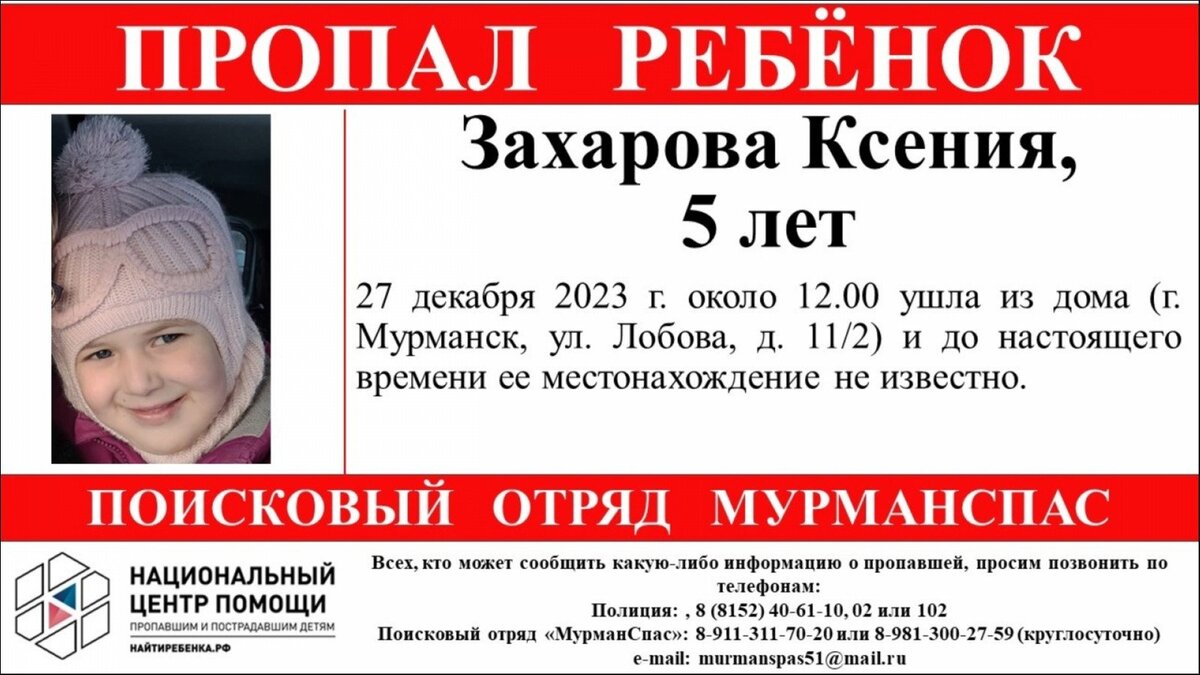 Ксения Захарова вышла из дома, который располагается на ул. Лобова, 11/2 в Мурманске. Где она находится сейчас, близкие не знают.