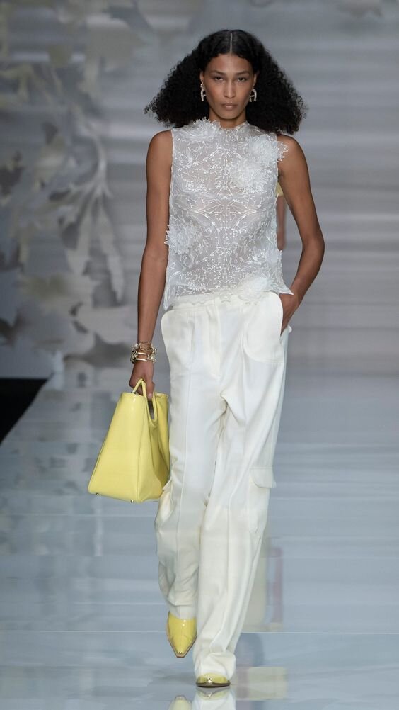 кому-то покажется это удивительным, но карго продолжают оставаться в центре внимания дизайнеров на протяжении последних нескольких сезонов, и в 2024 году они снова будут в списке модных трендов. В новом сезоне эта модель брюк представлена не только в широком, но и в длинном крое. Они выглядят особенно эффектно в сочетании с обувью на каблуке и облегающим верхом минималистичного дизайна.
