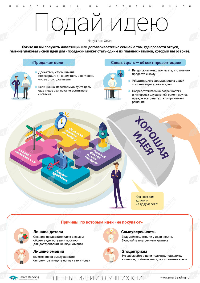 Создавать идеи недостаточно — их нужно воплощать. А для этого необходимо заручиться поддержкой: коллег, начальства, инвесторов или членов семьи. Нидерландский бизнесмен Йерун ван Хейл на основе своего богатого опыта написал книгу, которая поможет упаковать и продать любую идею самой требовательной аудитории. Вы узнаете о психологических типах слушателей, о презентациях представителям разных профессий, о подготовке площадки и управлении вниманием аудитории. Немного потренировавшись, с помощью этой книги вы сможете стать очень успешным продавцом идей (а главное — полюбите этим заниматься).