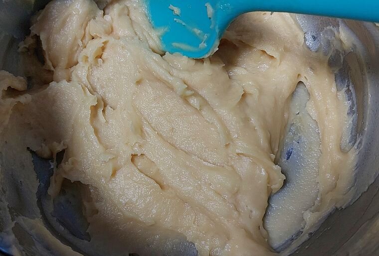 Теперь начинаем вмешивать в тесто по одному яйцу. Это обязательно, так лучше они вводятся в тесто. Тесто в итоге получается эластичное, но хорошо держит форму. Получится как очень густая сметана. Тесто удобно бу