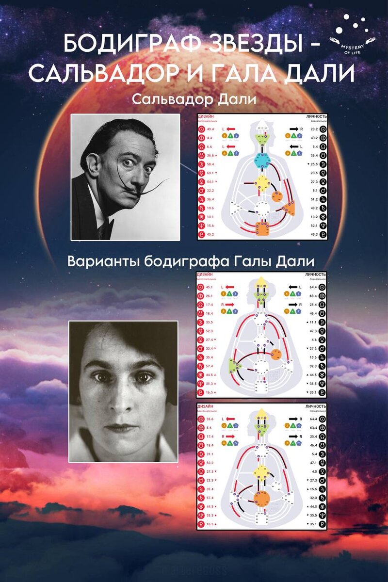 Мы решили рассмотреть композит Сальвадора и Галы Дали с точки зрения их взаимодействия. 🔍У нас есть точные данные Сальвадора Дали, но у Галы нет времени рождения, поэтому будем говорить о тех характеристиках, которые не меняются в течение дня. 🎨 Сальвадор Дали, пожалуй, самый известный и яркий человек в мире искусства. Искусством были и его отношения с Галой Дали. Гала (она же Елена Ивановна Гомберг-Дьяконова) была не просто женой, но и музой для Дали, вместе с этим у многих вызывая ощущение страха. Далеко не все понимали, чем они притянули друг друга. Но с точки зрения Дизайна многое становится понятным! ✉️ Сальвадор - Проектор 2/4. Он не просто проявление таланта, он само олицетворение канала 43-23, насколько «Фрика», настолько же и «Гения». Будучи воплощением индивидуализма, он обладал сильной непредсказуемостью и уникальностью, которая требовала распознания. И это распознание ему предоставила Гала. Гала имела безупречное чутье, благодаря своей Селезенке и каналу 26-44, он