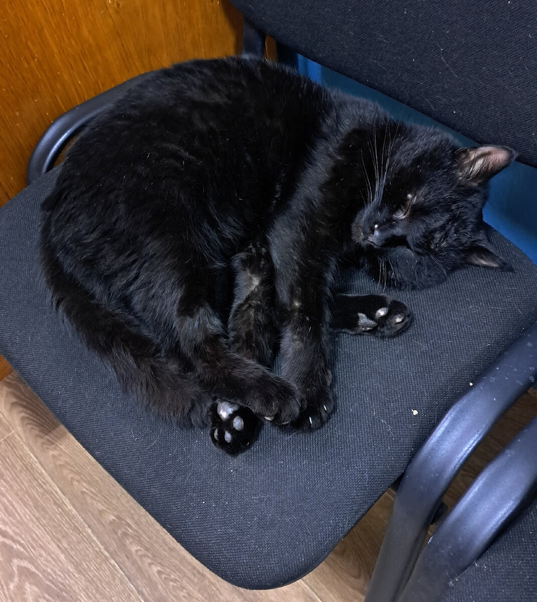 И вдруг в какой-то момент поведение котика резко изменилось: позавтракав, Сантана некоторое время стоял в нерешительности на прямой линии между своим стульчиком и дверью, а затем направлялся всё же к двери кабинета и издавал, не то чтобы очень уж решительное, но довольно громкое «мяу». Я открывала дверь, котик медленно, как бы ещё о чём-то раздумывая, переступал через порог. А дальше его обычный маршрут в сторону выхода из здания вдруг резко менялся, и Сантана, искоса и недовольно поглядывая на меня, молча, посылал сигналы: «Чего тут топчешься, открыла одну дверь, иди, работай, больше в твоих услугах не нуждаюсь!» И наглая чёрная морда важно уплывала за поворот коридора. В обед кот появлялся снова в нашем кабинете, но лишь для того, чтобы поесть, и снова скрывался за поворотом.