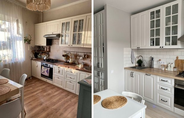 Меньше всего изменений коснулось кухни. Планировка устраивала, а кухонный гарнитур обновили — перекрасили фасады и заменили ручки. Плитку на полу и фартуке тоже оставили, а вот вместо принтованных обоев сделали светлые стены под покраску.