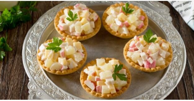 Простое и быстрое блюдо на Новый год. Тарталетки с крабовыми палочками и ананасом