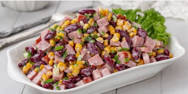 Простое и быстрое блюдо на Новый год. Салат с копчёной курицей, фасолью и кукурузой