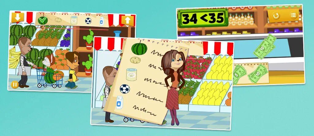 Простое игровое приложение для самых маленьких — от 3–4 лет. Тренирует внимание, развивает навыки счета и учит следовать плану. Герои мультфильма про семью Барбоскиных отправляются в супермаркет со списком покупок. Нужно помочь им собрать в корзину нужные товары, а потом рассчитаться на кассе. Для оплаты покупок ребенок должен выбрать подходящие по номиналу купюры или монеты. В игре есть реклама и платный контент.
