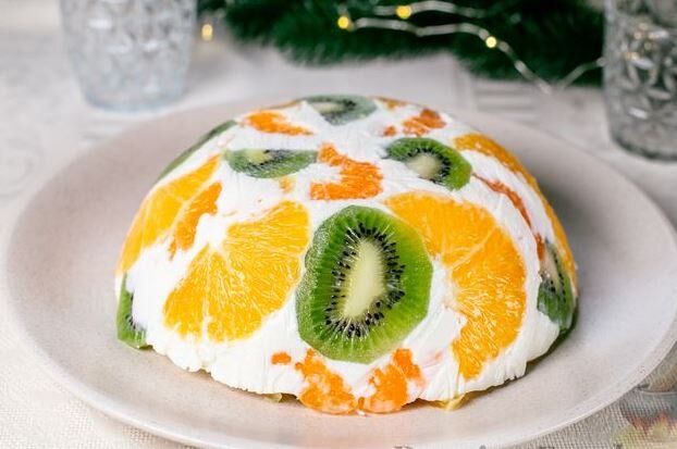 Красивый желейный творожно-сметанный торт украсит ваш праздничный стол. Нежная творожно-сметанная основа отлично гармонирует с кусочками апельсинов, киви и мандаринов. Выглядит такой десерт очень эффектно, ярко и аппетитно! Продукты Сметана 20 % - 350 г Творог жирность 9 % - 300 г Апельсины - 300 г (1 шт.) Мандарины - 200 г (2 шт.) Киви - 100 г (1 шт.) Сахар - 250 г Желатин - 25 г Ванилин - 1 щепотка Вода для замачивания желатина - 200 мл Шаг 1 Желатин заливаем холодной водой и даём ему набухнуть 10 минут. Шаг 2 Тем временем творог и сметану выкладываем в чашу блендера с насадкой "нож" и перебиваем до однородности.