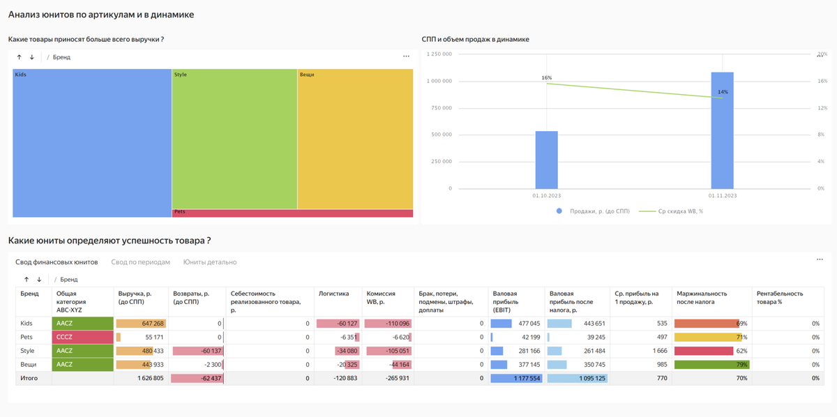 Юнит-экономика детально декомпозирует все цифры на уровне товарной матрицы — бренды, категории, артикулы.
