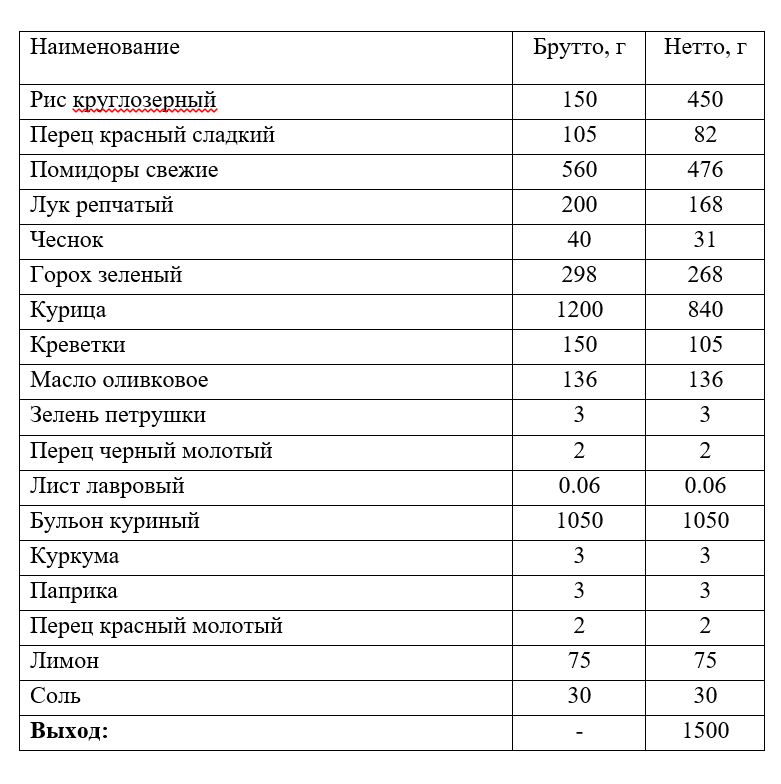 Часть 2. Практическая Технология приготовления блюда «Paella» Технологический процесс: У курицы отделяют мякоть от костей и кожи. Из костей варят бульон, добавив лук и лавровый лист. Сладкий перец и куриную мякоть нарезают кусочками. Креветок очищают и отваривают. Лук и чеснок мелко нарезают Помидоры ошпаривают, кусочки курицы обжаривают на масле до образования румяной корочки, затем убирают со сковороды. На этом же масле обжаривают лук, чеснок и сладкий перец. Через 4 минуты добавляют рис и жарят еще 2 минуты. Затем добавляют помидоры, соль, перец, рубленую зелень, куркуму, вливают бульон и тушат без крышки 15 минут. Курицу, креветок кладут сверху. Вливают немного креветочного бульона и тушат еще 10 минут. Паэлью посыпают рубленой зеленью петрушки, сверху кладут лимон, нарезанный дольками. Органолептические показатели качества: Внешний вид: характерный данному блюду. Цвет: характерный для входящих в состав изделия продуктов. Вкус и запах: характерный для входящих в состав издели