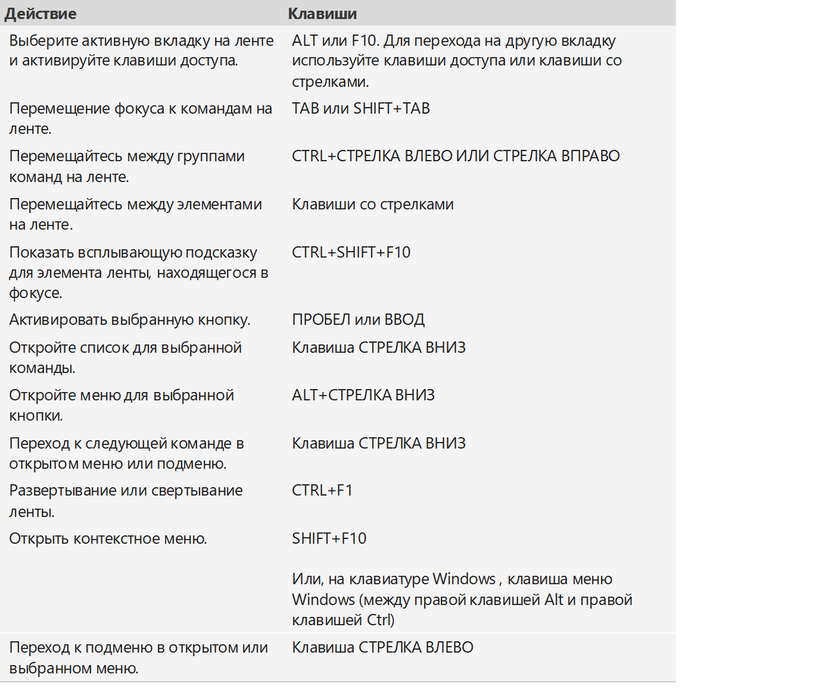 Работа с вкладками ленты с помощью клавиатуры