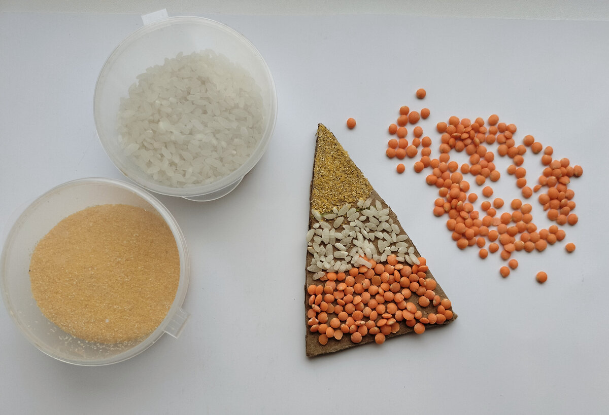 Для этой игры нам понадобится различная крупа, немного. Какая у вас есть дома. Нужно три или четыре вида круп. Для удобства насыпьте её в маленькие чашечки. Заготовка ёлки - это треугольник из картона, желательно плотного, можно вырезать из коробки. И клей ПВА. Когда всё готово,садимся с малышом за стол или на пол, как комфортно. Показываем ему заготовку, говорим, что это форма треугольник. Ёлка имеет форму треугольника,и сейчас мы будем её украшать. Для удобства лучше разделить заготовку на три части, можно даже провести линии, чтобы малыш видел границы. Также можно проговорить низ верх и середина у елочки, заодно выучив эти понятия. Наносим клей на нижнюю часть, полностью. Малыш берет пальчиками крупу и сыпет туда,где клей. Мама помогает. Так проделываем и с остальными частями. Можно сыпать разную крупу. Выбор за малышом. Играя и делая поделку мы знакомимся с фигурой треугольник, понятиями верх, низ, середина, развиваем речь и мелкую моторику ручек ребёнка. Полезных вам занятий!