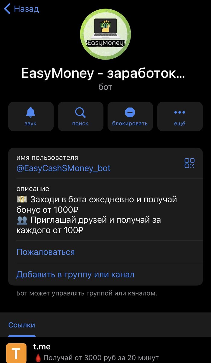 Доброго времени суток, дорогие читатели. Сегодня я хочу вам рассказать про очередной «прекрасный» бот по заработку без вложений в телеграмм. EasyMoney - заработок на заданиях. Вот таким сообщением приветствует нас бот. Зарабатывать этот бот предлагает несколькими способами: Звучит как сказка. Я захотел проверить. После нажатия на кнопку начать, я забрал ежедневный бонус в размере чуть больше 14 тыс рублей. ВАУ! Действительно легкие деньги. Быстрее бегу выводить. Но как всегда есть нюанс. Нужно привлечь 10 рефералов. Чуть позже мне написал человек, который тоже зашел в этот проект, ему дали бонус и ему удалось привлечь 10 рефералов, и тут началось самое интересное. Подав заявку на вывод, нужно написать администратору номер заявки, после чего он сразу должен был выслать вам сумму. Ну конечно…вот сообщение от администратора, пока прям ничего страшного не видно. Перейдя по ссылке в самом низу открывается инструкция по выводу средств. Мягко говоря сомнительного характера. Для начала нужно