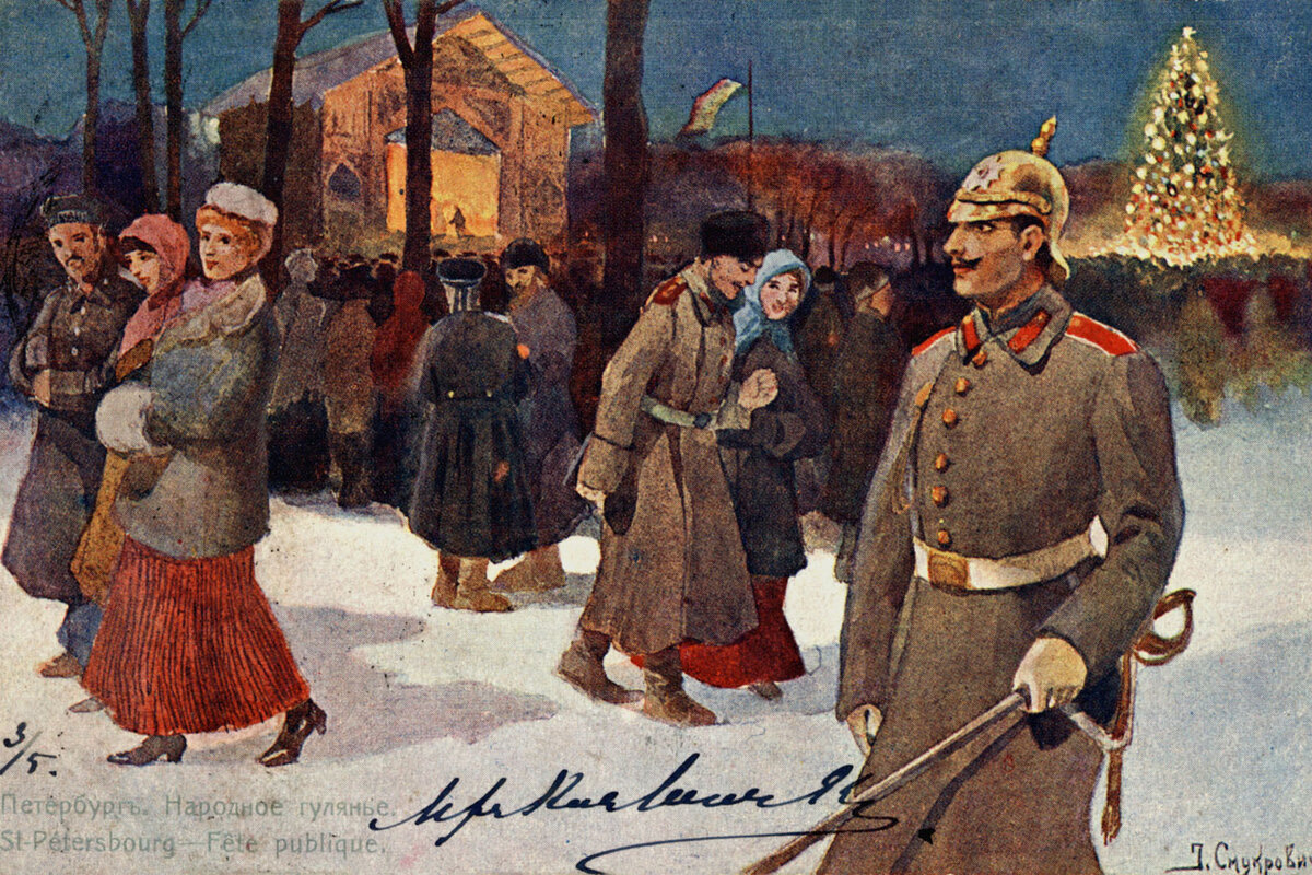 В годы Первой мировой войны на рождественских открытках появляются молодые люди в военной форме и ласково на них поглядывающие девушки в зимних нарядах. Символы эпохи появлялись на открытках и позже, в советские годы.