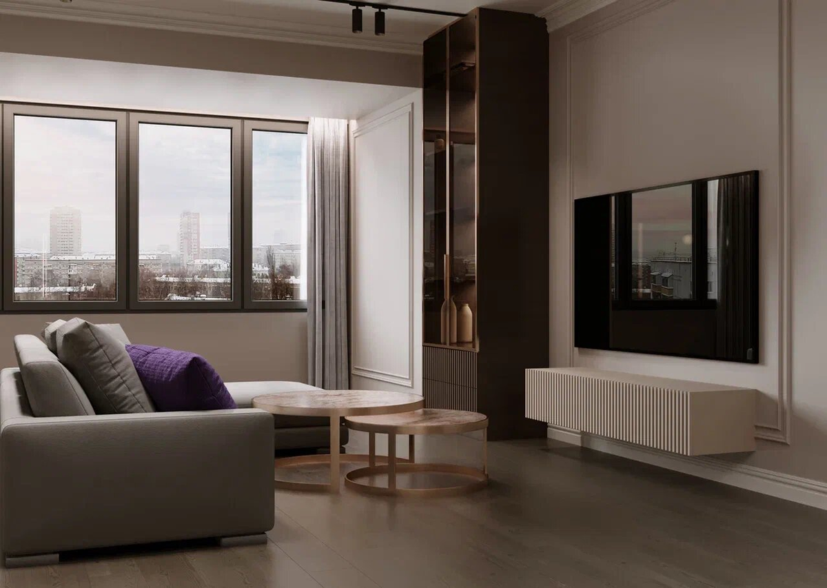 Трехкомнатная квартира для семейной пары с тремя детьми в современном стиле с элементами неоклассики, с прихожей, кухней-гостиной, спальней, лоджией, двумя детскими и двумя санузлами.