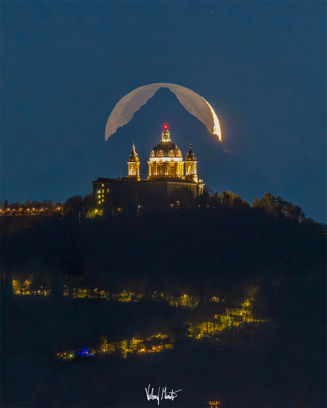 ...между ценой и ценностью. Итальянец Валерио Минато из Турина — фотограф опытный. Снимки его стоят недёшево, но и самому Валерио приходится попотеть. Кадр, который 25 декабря 2023 года, как Гагарин, облетел интернеты всего мира и продолжает наматывать витки, — хорошее тому подтверждение. Мастер признавался, что ещё шесть лет назад задумал сфотографировать тройное выравнивание заходящей Луны, горы Монвизо в Пьемонте и базилики Суперга — церкви XVIII века, стоящей на высоком холме. Событие происходит нечасто и длится недолго... ...поэтому Валерио провёл обстоятельную подготовку. Надо ведь не только вычислить подходящий для съёмки момент, но и найти лучшее место, и оказаться там в нужное время. На протяжении шести лет фотограф методично совершал все процедуры, но — то дождь, то снег, то коронавирус, то ночной туман, то ещё какие-то помехи не давали сделать ясный и чёткий снимок. А во второй половине декабря 2023 года пару недель стояла идеальная погода, и мечта Валерио сбылась. Более тог