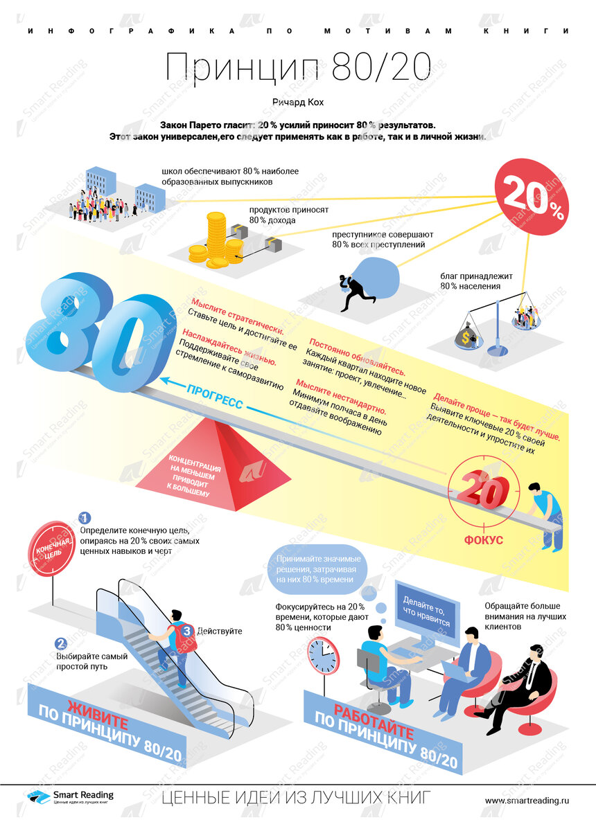 Ричард Кох 📖 О книге Универсальный принцип 80/20 был открыт в 1897 году итальянским экономистом В. Парето. Он гласит, что благодаря 20% усилий достигается 80% результатов. Цифры не являются точными ориентирами, они скорее мнемоническое правило. Известно, что в таком соотношении распределяется мировой капитал между богатыми и бедными, что 80% доходов компаниям приносят всего 20% клиентов. Значит можно достичь большего, затрачивая меньше ресурсов. Нужно сосредоточиться на том, что действительно имеет значение. Так умножают эффективность любой организации или человека, снижают стоимость услуг при сохранении высокого качества. Закон Парето работает во всех сферах человеческой жизни, но лучше всего — в менеджменте и экономике. Ричард Кох объясняет, как использовать принцип высокоэффективных людей систематически. 📝 Зачем читать • Применить принцип 80/20 к своей профессиональной карьере и личной жизни. • Научиться добиваться большего, затрачивая меньше усилий. • Выстроить мировоззрение та