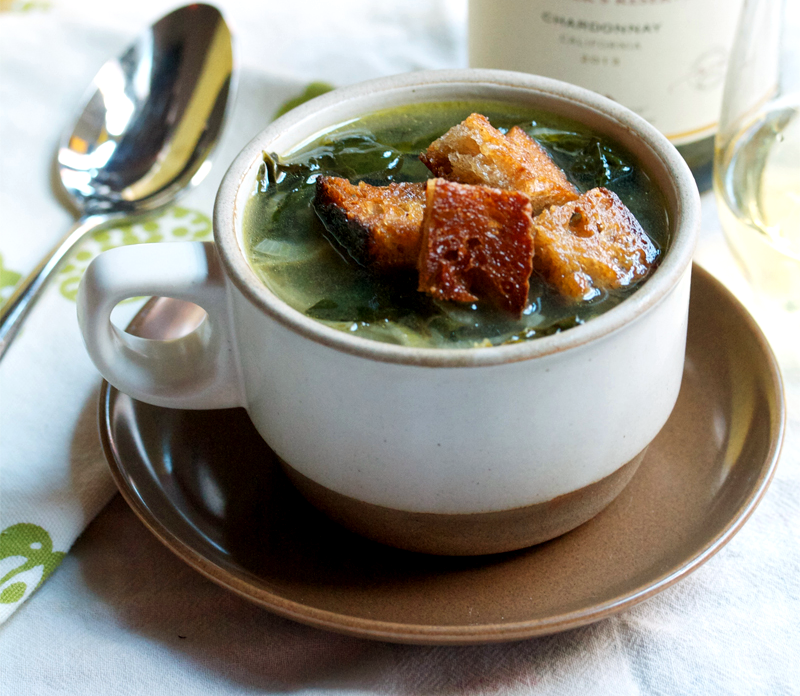 ИНГРЕДИЕНТЫ/3-4 ПОРЦИИ: 1½ ст.л сливочного масла, 2 маленькие луковицы, 5 очищенных зубчиков чеснока, 1 кочан капусты кале, 4 стакана куриного бульона, 3 ст.л выдержанного Шардоне, 3-4 ломтика слегка черствого хлеба, соль, оливковое масло.