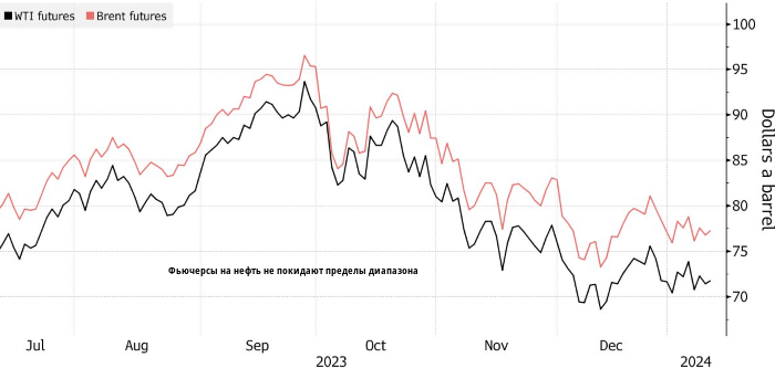 Нефть подорожала на фоне сохраняющейся напряженности на Ближнем Востоке. Слабеющий в ожидании данных по инфляции доллар также подстегнул рост цен Динамика цен на нефть. Источник: Bloomberg Нефть марки Brent поднялась выше $77 за баррель, отыграв часть падения, спровоцированного данными по запасам в США. West Texas Intermediate направилась к отметке $72 за баррель. Геополитическая напряженность на Ближнем Востоке растет, поскольку США и союзники взвешивают варианты ответных мер против йеменских боевиков за нападения на суда в Красном море, из-за которых количество танкеров, перевозящих нефть и продукты через Баб-эль-Мандебский пролив, сократилось примерно на треть. С начала года рынок не может определиться с направлением. Рост цен сменяется падением, поскольку трейдеры пытаются оценить перспективы и понять, как текущие конфликты повлияют на логистику и состояние отрасли в целом. По мнению Vitol Group, в 2024 году рынок будет относительно сбалансированным, так как спрос растет медленнее