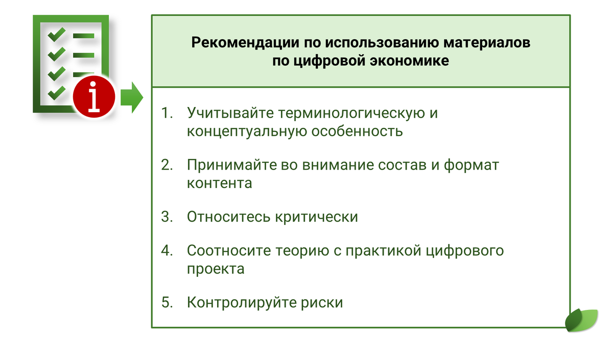 В настоящее время исследовательские, методические и аналитические материалы по цифровой экономике лучше воспринимать критически – знакомясь, обдумывая и попутно делая выводы об их релевантности, адекватности, достоверности и целостности. Не помешает беспристрастно оценить источник информации, поскольку можно столкнуться как с цифровым карго-культом, так и с мошенничеством или маркетинговыми уловками. Особенно это касается завышаемых ожиданий от внедрения цифровых технологий и использующих их цифровых продуктов и сервисов. Безусловно, для корректного критического подхода требуется определенный уровень знаний и компетенций в соответствующей предметной области и в связанных, смежных областях. Поэтому важно исследовать множество экспертных точек зрения и результатов цифровых проектов, чтобы учиться их непредвзято оценивать и отбирать.