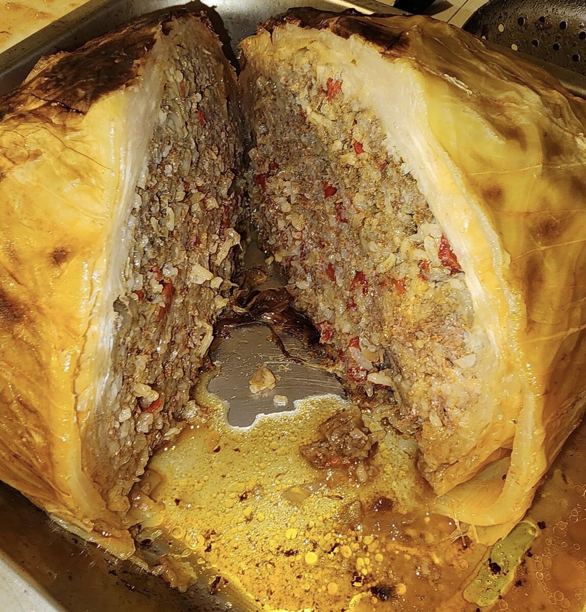 Накройте открытую часть капусты внешними листьями кочана, затем поместите кочан отверстием вниз, перевернув. Готовим соус-заливку: На слабом огне тушим кочан в течение полутора-двух часов, затем вынем аккуратно его на противень и запечём на сильном жаре 10 минут, чтобы подрумянить. Оставшийся в кастрюле соус я заправила сливочным маслом и сливками, а при подаче поливала блюдо полученным соусом.