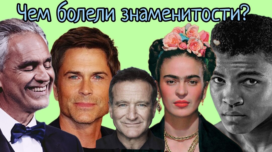 Мы думаем, что знаменитости не болеют, потому что у них лучшие врачи, но эта не так, при некоторых заболеваниях медицины бессильна. Но некоторым это не мешает строить карьеру и быть успешными. Андреа Бочелли Знаменитый итальянский тенор в детстве болел глаукомой. При этой болезни повышено внутриглазное давление, что приводит к потери зрения. Операции ему не помогли и зрение он окончательно потерял в 13 лет. Но это не мешает ему гастролировать по всему миру и быть женатым Роб Лоу Некоторые источники говорят, что он переболел вирусным менингитом, а некоторые, что паротитом. Но после болезни, актер оглох на правое ухо в 8 месяцев. Лечение ему не помогло, тем не менее актерской карьере это нисколько не помешало. Кристофер Рив Он сыграл самого первого Супермена, но в 1995 году во время скачек на лошади, конь его скинул и он приземлился на голову, после этого он оказался прикован к инвалидному креслу. Но и ему это не помешало строить карьеру дальше, он озвучивал фильмы, режиссировал филь