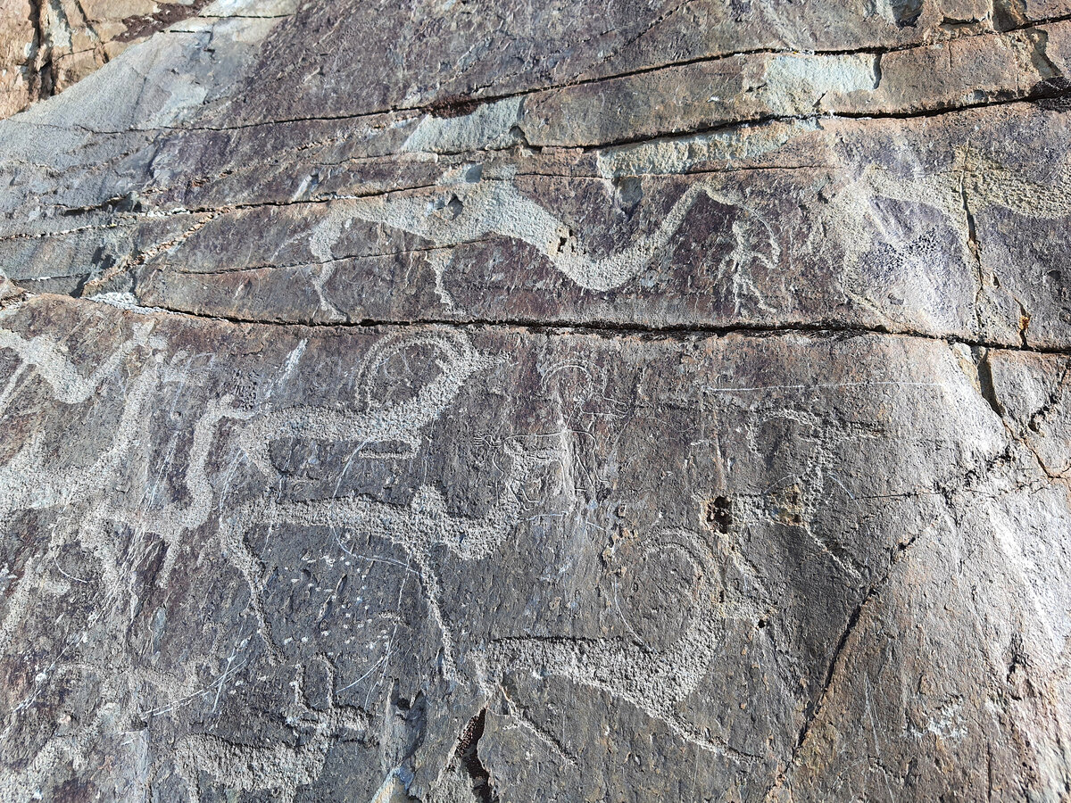 Горный Алтай - Плато Укок - Зона Покоя Плато Укок - Бертекская Писаница » смотреть начало Итак, после визита к Алтайской Принцессе мы направились в сторону Бертекской Писаницы, которая находится примерно в десяти километрах от кургана Принцессы (видео Бертекская Писаница). Зато, какие это были десять километров! По пути нам пришлось бро́дить три реки - Акалаху, Аккол и Калгуты. Про бездорожье даже и не вспоминаю... Здесь оно - норма! Писаницами называют изображения, высеченные на стенах пещер, камнях и скальных поверхностях. Они встречаются во всех странах света и относятся к самым разным эпохам - от палеолита до средневековья. Среди бескрайних просторов горного Алтая есть такая гора Кызыл-Тас или Красная скала, высота её над уровнем моря - 2200 метров. А на одном из скальных выступов горы и находится Бертекская Писаница - плод творчества древних людей урочища Бертек. Она включает в себя около 120 наскальных рисунков - петроглифов. Эти петроглифы относятся к нескольким эпохам, сам