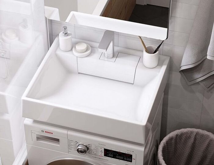 Тоже касается и высоты излива. Сами по себе раковины, для установки над стиральной машиной, имеют небольшую высоту (8-10 см). Если смеситель слишком высокий, будут брызги. Тут все понятно. Если смеситель так же имеет небольшую высоту, у вас между его кончиком и дном раковины будет примерно 12 см. Опять же, это рождает неудобно, которое можно устранить в самом начале, подобрав правильный смеситель.