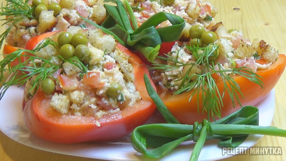 зеленый лук, соль Отварное куриное филе нарезаю на мелкие кубики таким же образом режу помидоры На мелкой терке натираю сыр Мелко шинкую зеленый лук и смешиваю его с помидором, мясом, зеленым горошком и сыром Если вы любите кукурузу то ею можно заменить зеленый горошек. Солю салат по вкусу. Перемешиваю. В оливковое масло добавляю горчицу и сок лимона. Хорошенько перемешиваю и поливаю салат. У белого хлеба срезаю корочки и нарезаю его на мелкие сухарики Обжарю их до румяности на сливочном масле с добавлением раздавленного чеснока Очищенный болгарский перец разреза
