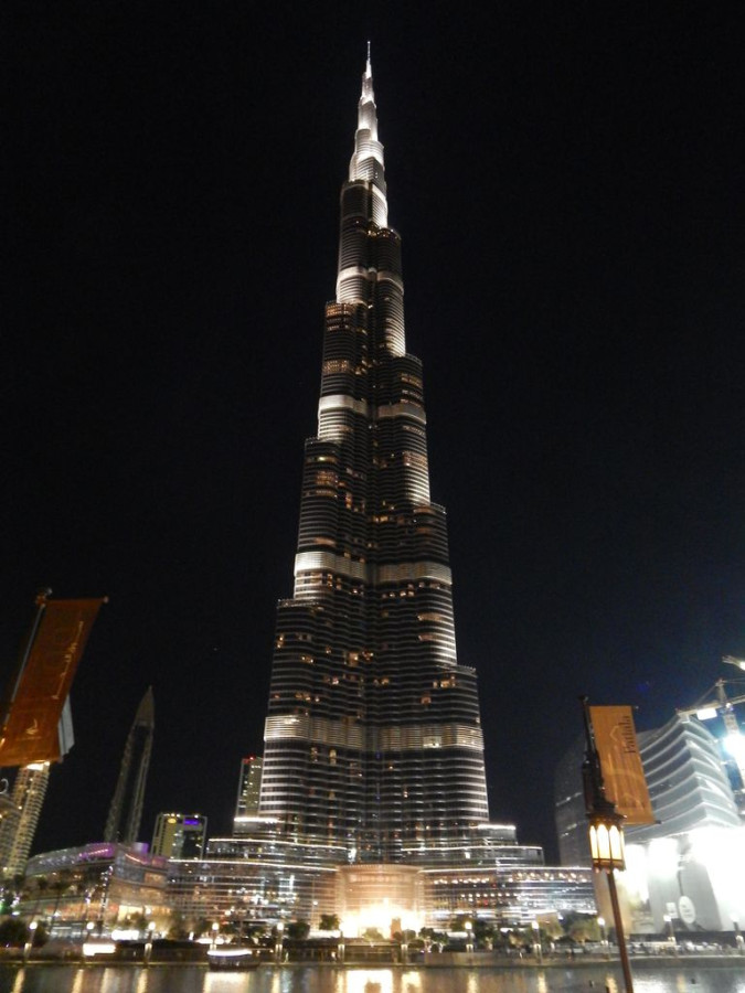 Она прекрасна. Перед башней расположен большой пруд (хорошо, рукотворное озеро) и с наступлением темноты раз в полчаса работают музыкальные фонтаны. Незабываемое зрелище: водяные струи, взлетая на высоту до 150 метров (пятидесятиэтажный дом), танцуют как живые. Рекорды: высочайшее здание за всю историю человечества — 828 м (предыдущий рекорд — 508 м у небоскрёба Тайбэй 101 на Тайване), здание с наибольшим количеством этажей — 163 (предыдущий рекорд — 110 у небоскрёбов Уиллис-Тауэр и разрушенных башен-близнецов). Стоимость проекта: 1,5 млрд. долларов.