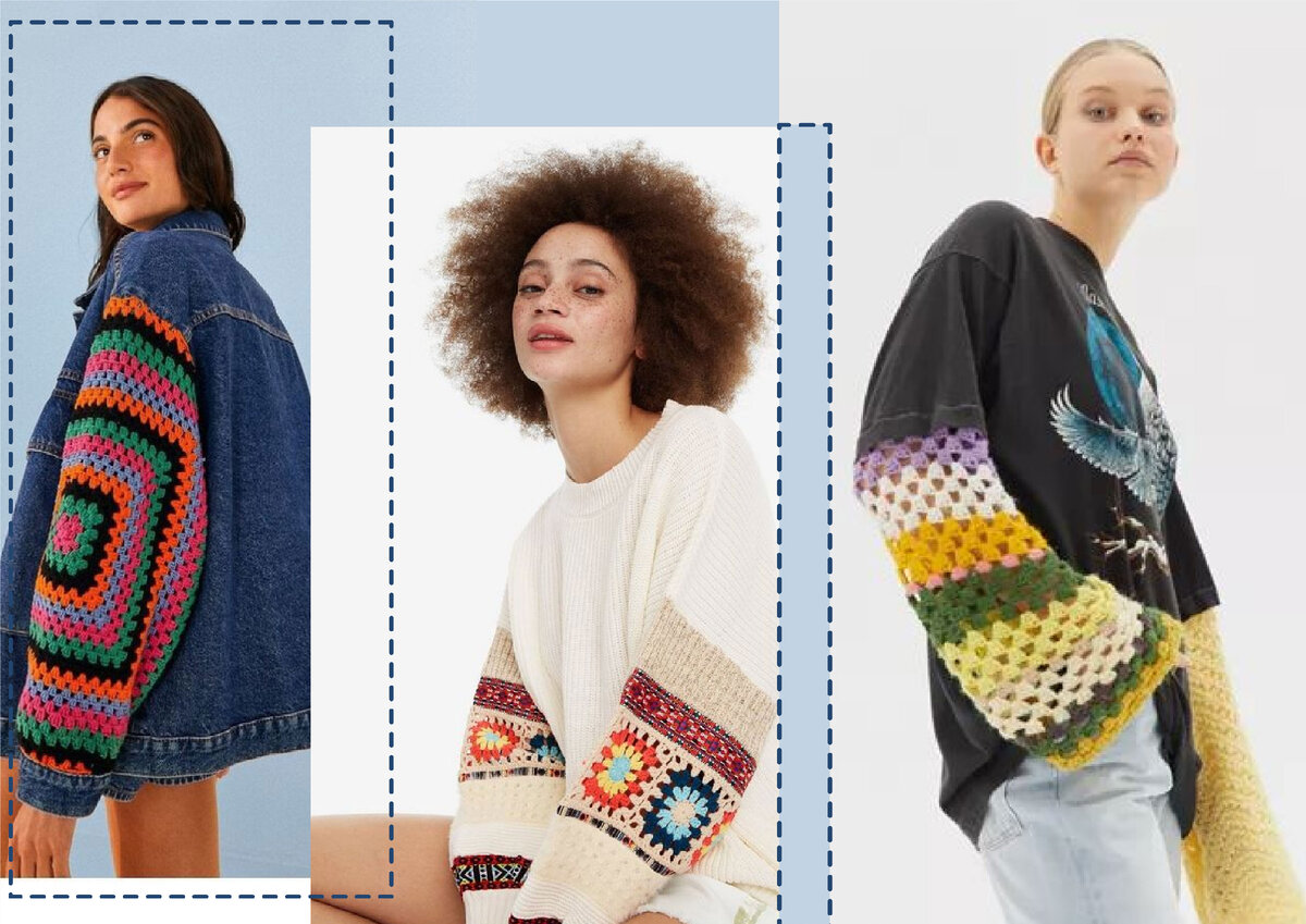 Подружка увидела, и забрала себе мой новый лонгслив (я соединила вязанные рукава от старой кофточки и футболку). После этого я так вдохновилась, что ещё решила создать парочку интересных кофточек. Подобрала современные, но лёгкие в исполнении варианты, делюсь с вами: Такие рукава можно связать или воспользоваться старыми трикотажными или вязанными изделиями. В конце вариант, который легко подойдёт к любому низу (юбкам/брюкам) Украсить вязанными рукавами можно всё, что угодно: от курток, до футболок Не умеете вязать? тоже не проблема! ( К тёмной джинсовке - тёмные цвета рукавов, а к светлой джинсовке - используйте более светлую гамму) Также можно использовать более частые, мелкие полоски на рукавах. Узоры, связанные крючком, тоже смотрятся современно и интересно: Квадратные раппорты красиво смотрятся и на белом/чёрном фоне, и на каком-нибудь цвете) (заметили, как на первом зелёно-охристом анораке красиво просвечивает сквозь крупную вязку рукава жёлтая рубашка?!) Цветочный узор на вяза