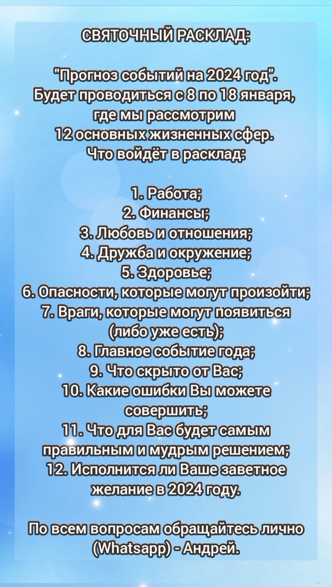 Друзья, у нас начались Святочные расклады, а именно "Прогноз событий на 2024 год". В связи с большой записью на святки, я продлил запись на более позднее и вечернее время, сделал корректировку своего рабочего графика. Спешите записаться, кто не успел, т.к. количество мест ограничено.