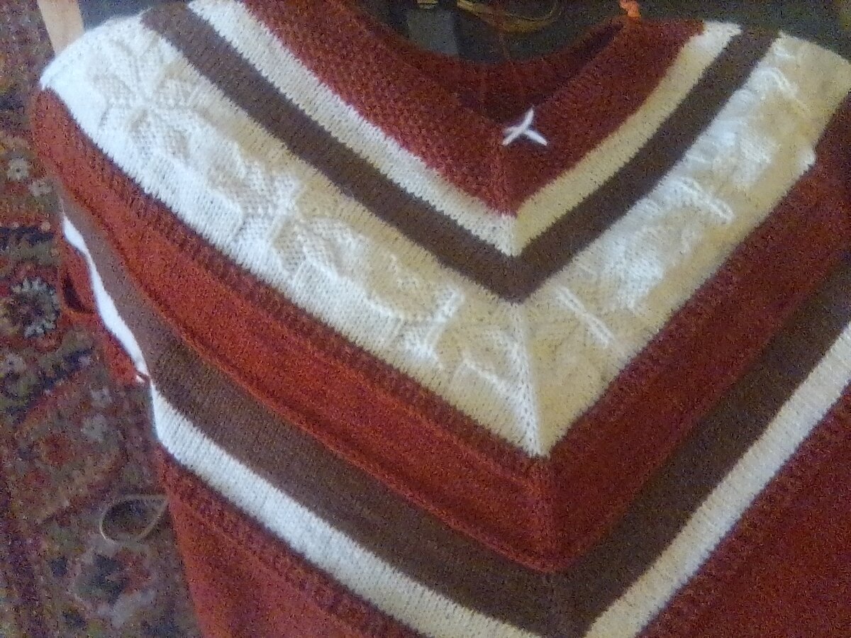 Итак, пропорция 106 всех петель—41 см, а Х петель на рукава, - 18 см, далее, 106*18/41=47 петель. 47 идут на рукав, остальные на тушку. И вот мы принялись вывязывать тушку, пересняв петли рукавов на дополнительную нить или спицу. Под рукавами между передней и задней частями тушки надо набрать несколько, ну, пять петель для подреза, чтобы не стягивало изделие под рукавами. И продолжать вязать тушку, прибавляя по центру переда и спинки и столько же убавляя в боковых линиях, которые можно оформить одной петлей или двумя по центру. И вот, вы связали все запланированные полоски, и вяжете базовым цветом низ изделия. Продолжайте вязать точно так же до желаемой длины. Рис. 5