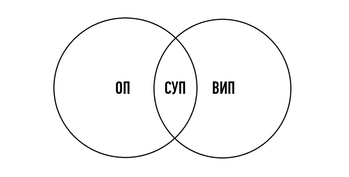 Схематично три пространства изображены на рисунке ниже. Субъективное пространство СУП накладывается как на пространство объективное ОП, так и на пространство виртуальное ВИП. Можно сказать также, ОП и ВИП частично отражаются в СУП. ОП и ВИП всегда больше, чем СУП и никогда не могут быть ему доступны полностью.