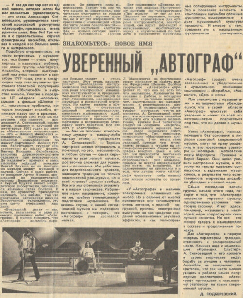 Подобную откровенность не часто встречаешь у музыкантов, тем более — столь популярных и известных публике, как члены группы «Автограф». Ансамбль, впервые выступивший под этим названием в сентябре 1979 года, уже в следующем году стал лауреатом фестиваля советской популярной музыки «Тбилиси-80» и выпустил миньон. Участие в передаче ЦТ «Адреса молодых», съемки в фильме «Шляпа» — и... постоянные проблемы, которые лихорадят ансамбль, отнимают массу сил и времени.